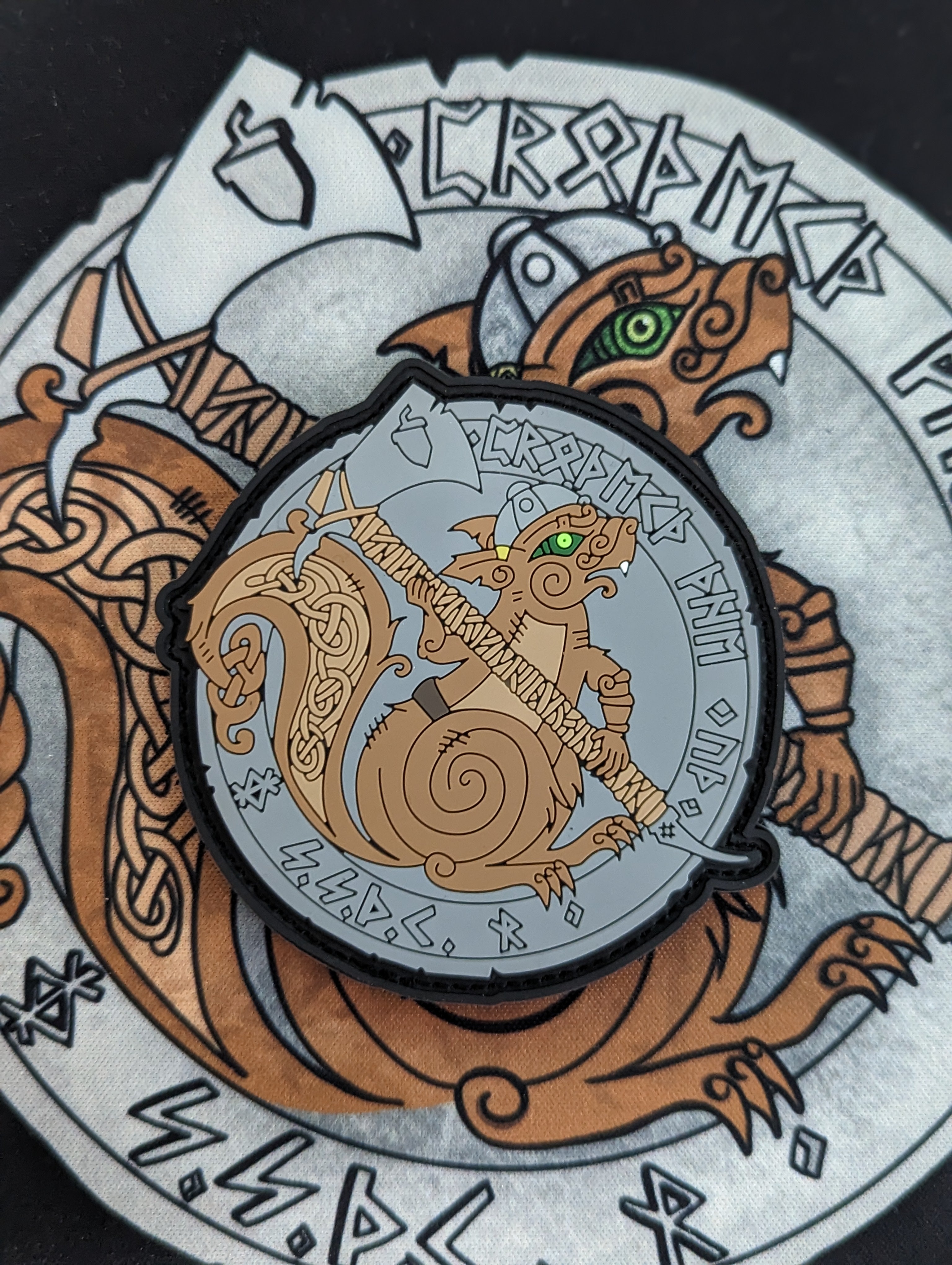 Unleash the power of Ratatoskr, the legendary warrior squirrel! Inspired by Norse mythology and Viking artistry, this intricately designed morale patch features Ratatoskr wielding a battle axe, adorned with Celtic knotwork and runic inscriptions. His piercing green eyes reflect the ferocity of battle, symbolizing courage, cunning, and an indomitable warrior spirit.