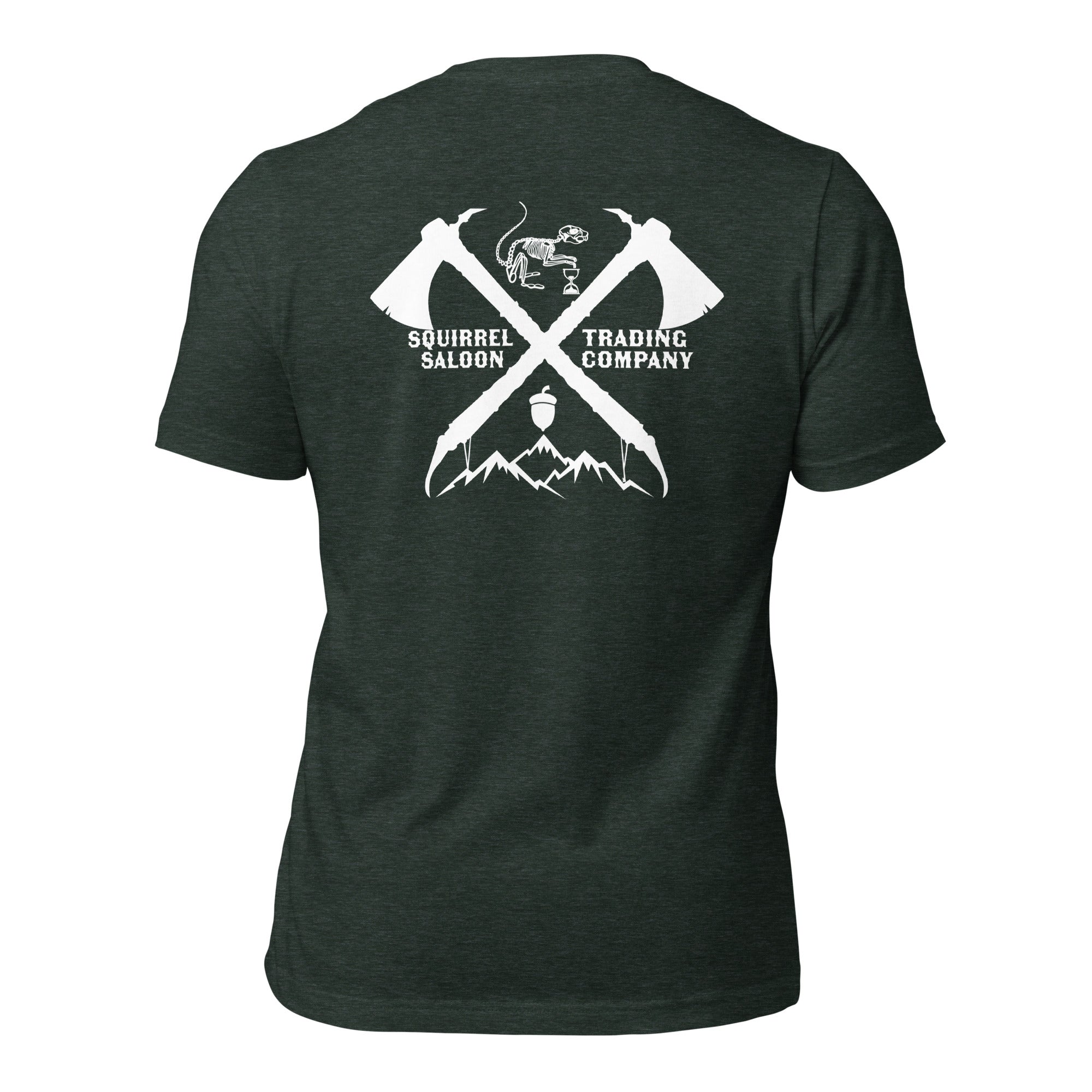 Built for the bold and ready for the wild, the Crossed Hatchets T-Shirt from Squirrel Saloon Trading Company delivers rugged style with frontier energy. Featuring a subtle left chest logo on the front and a bold full-back print of crossed ice axes, a bone squirrel with hourglass, mountain range, and acorn emblem — this shirt makes a powerful statement from every angle.