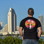 Soak in the golden vibes of the coast with this vibrant tee, featuring a bold graphic of two white palms in a potted plant silhouette that stands out against a retro-striped sunset backdrop in warm hues of orange, red, and violet. The design is beautifully framed by the iconic San Diego skyline and Coronado Bridge, paying tribute to the laid-back charm of this beloved city.