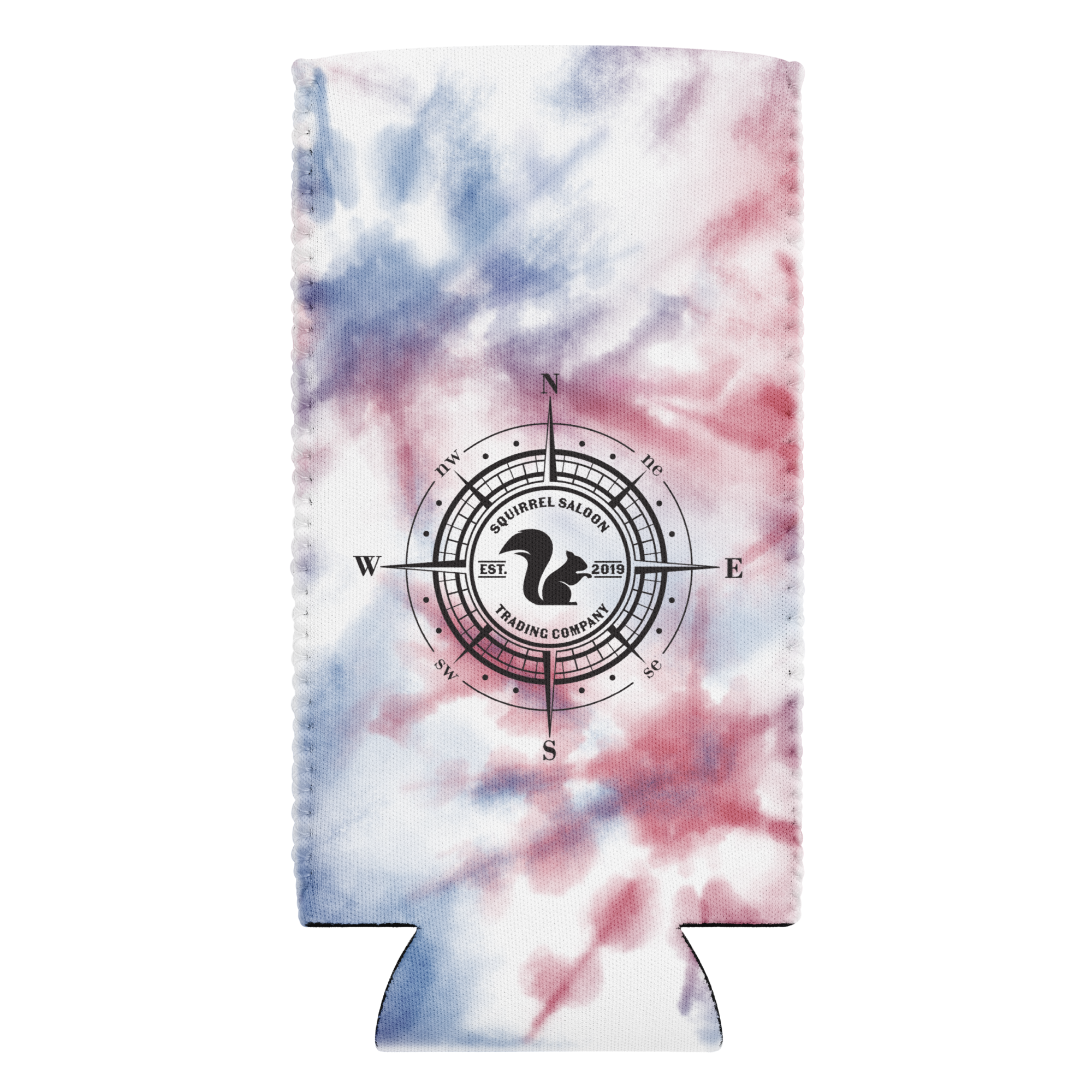 The Woodland Navigator can cooler blends rustic adventure with bold summer color. Wrapped in a red, white, and blue tie-dye pattern, this koozie features the iconic Squirrel Saloon compass emblem on one side and our classic squirrel silhouette on the other. Designed for explorers, campers, and wanderers at heart, it keeps your drink cold while guiding your trail spirit in true SSTC style.