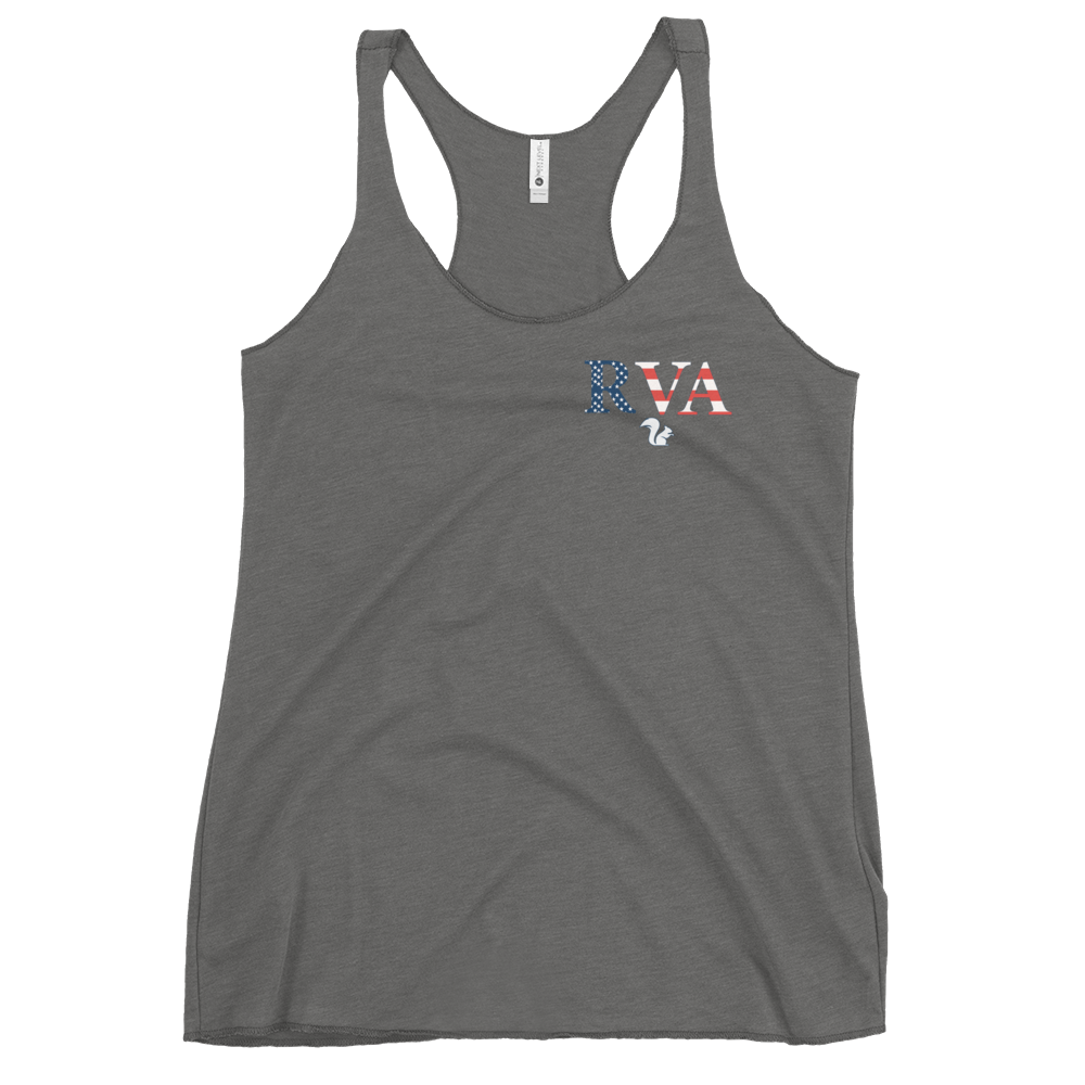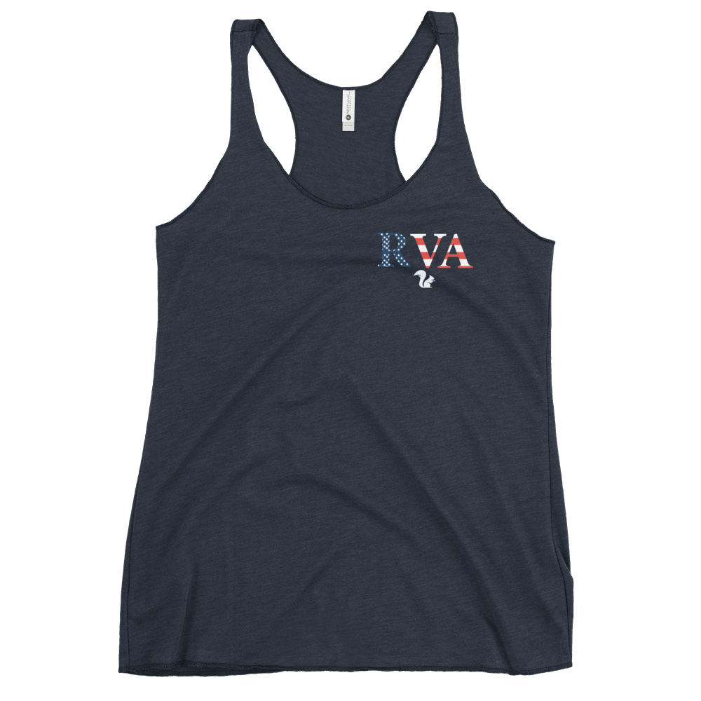 Show your Richmond pride in warm-weather style with the RVA Squirrel Women’s Racerback Tank. Featuring bold RVA lettering in a patriotic American flag design with the signature Squirrel emblem beneath, this tank celebrates the energy of Richmond and the spirit of Squirrel’s Saloon.