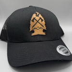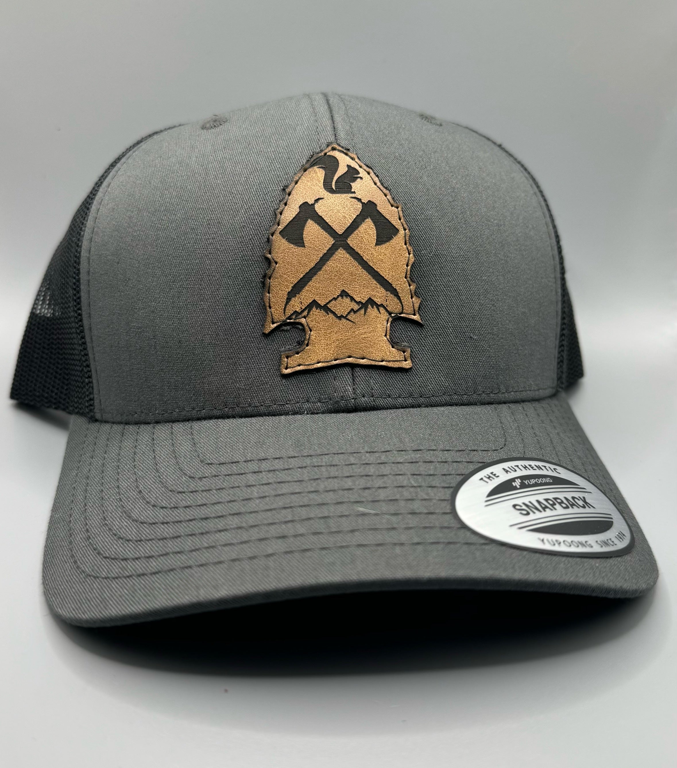Elevate your outdoor style with the Squirrel Saloon Trading Company's Trucker Hat. Featuring a rugged yet refined look, this hat boasts a premium leather patch showcasing a unique design of crossed hatchets and mountain peaks, all shaped into a stylized arrow head silhouette. The durable fabric ensures a blend of versatility and timeless appeal, while the breathable mesh back and adjustable snapback closure provide all-day comfort and a perfect fit.