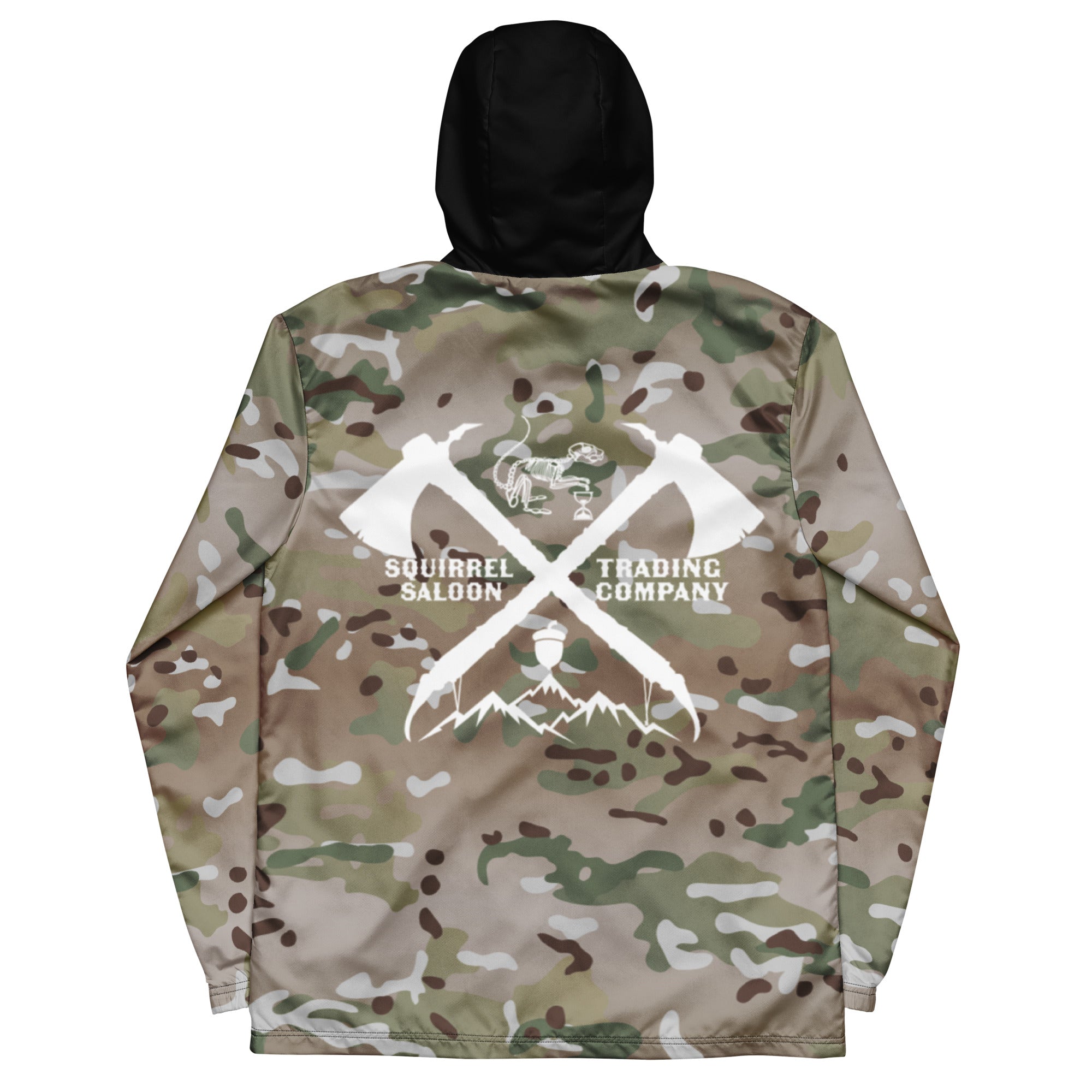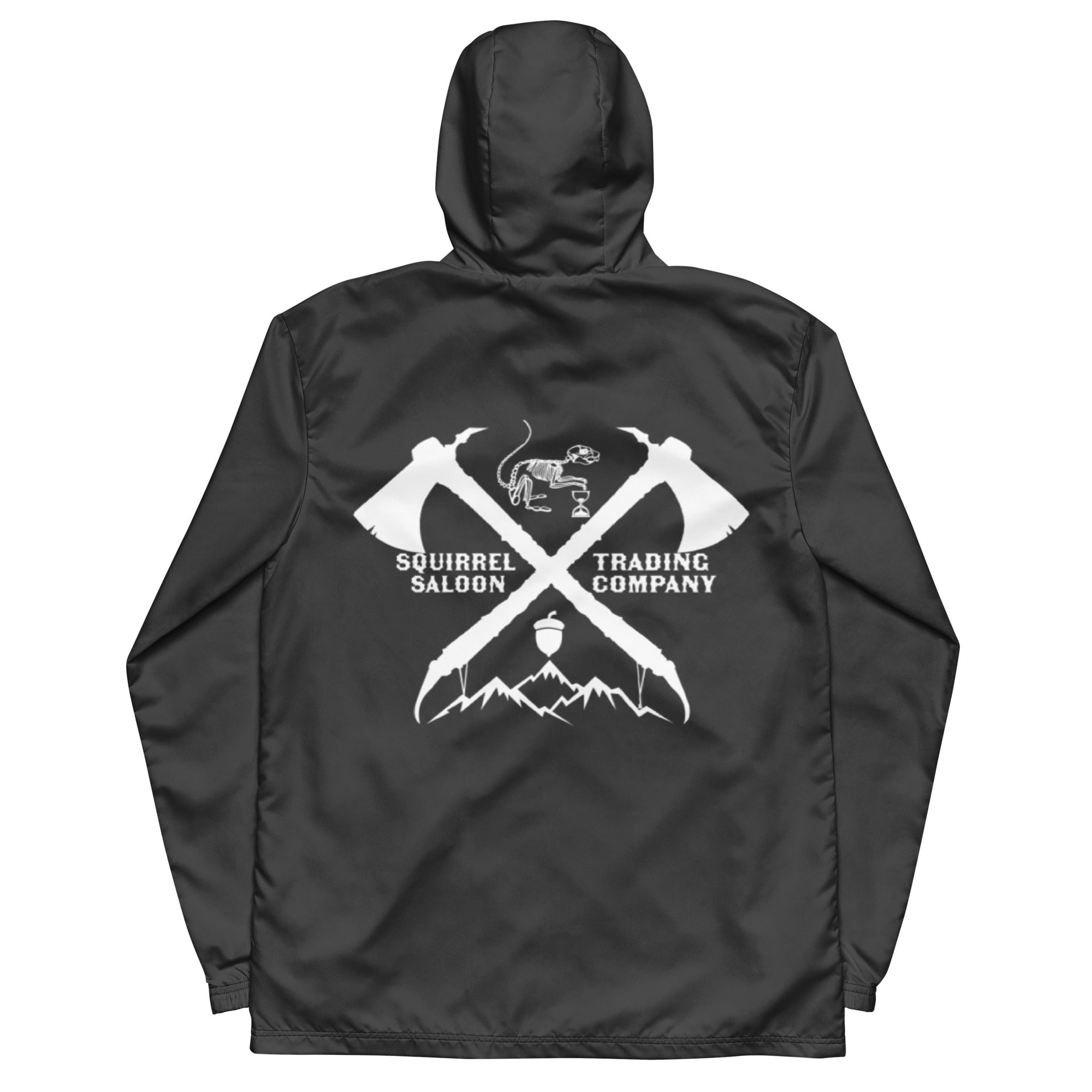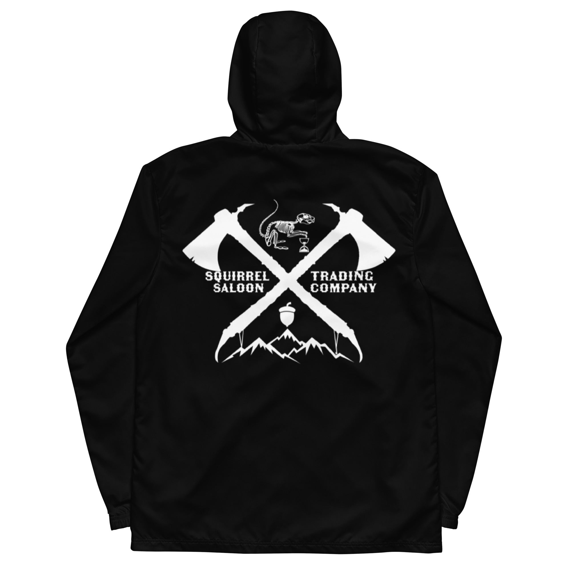 Gear up for untamed adventures with this windbreaker, featuring a bold crossed hatchets emblem with mountain, acorn, and skeleton (bone) squirrel details that evoke resilience and the fleeting nature of time. Designed for those who live boldly and roam freely, the graphic blends survivalist edge with street-ready style.