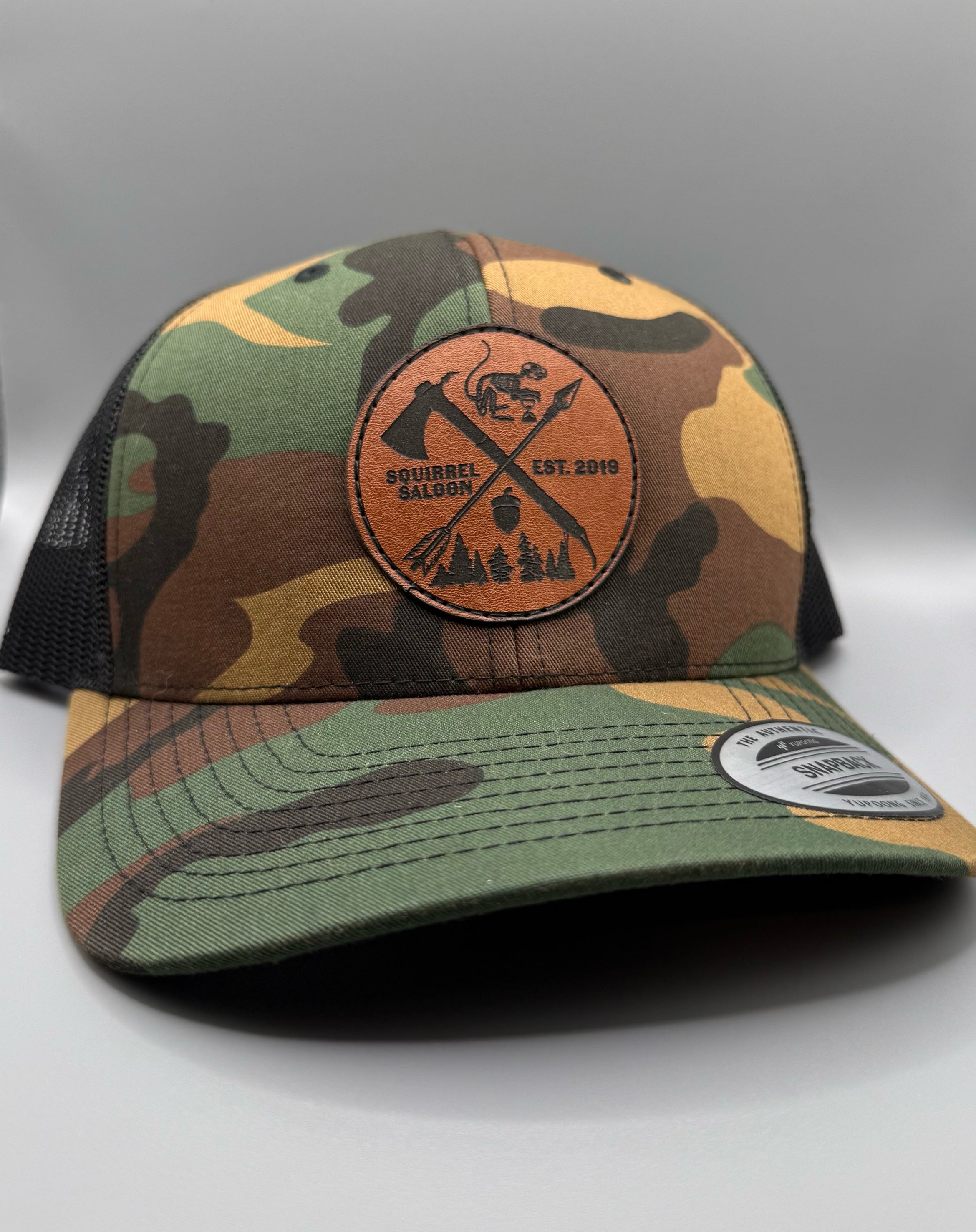 The centerpiece of this rugged cap is a genuine leather patch, embossed with an axe, spear, acorn, and forest scenery, embodying the spirit of the wild. A fearless squirrel perches above, adding that signature Squirrel Saloon touch, while "Squirrel Saloon – Est. 2019" proudly marks the legacy of adventure and camaraderie.